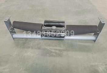 雙中輥調(diào)偏托輥組回轉(zhuǎn)軸焊在下橫梁上,回轉(zhuǎn)總成(包括組合軸承、回轉(zhuǎn)軸套)安裝在下橫梁上方,回轉(zhuǎn)總成外圍設(shè)計(jì)了可擺動的中托輥橫梁,以回轉(zhuǎn)軸為中心,在運(yùn)行膠帶前、后中托輥橫梁上各設(shè)置一個中托輥,形成以回轉(zhuǎn)軸為中心的平衡支撐。側(cè)托輥采用加大軸承和軸徑設(shè)計(jì),用側(cè)托輥軸代替常規(guī)的側(cè)托輥橫梁功能。側(cè)托輥可拆卸的安裝在兩中輥中間。側(cè)托輥為錐形輥設(shè)計(jì),錐形輥采用鑄橡膠結(jié)構(gòu),其在膠帶跑偏時(shí)能產(chǎn)生較大的回向阻尼效果,從而使膠帶居中平穩(wěn)運(yùn)行。